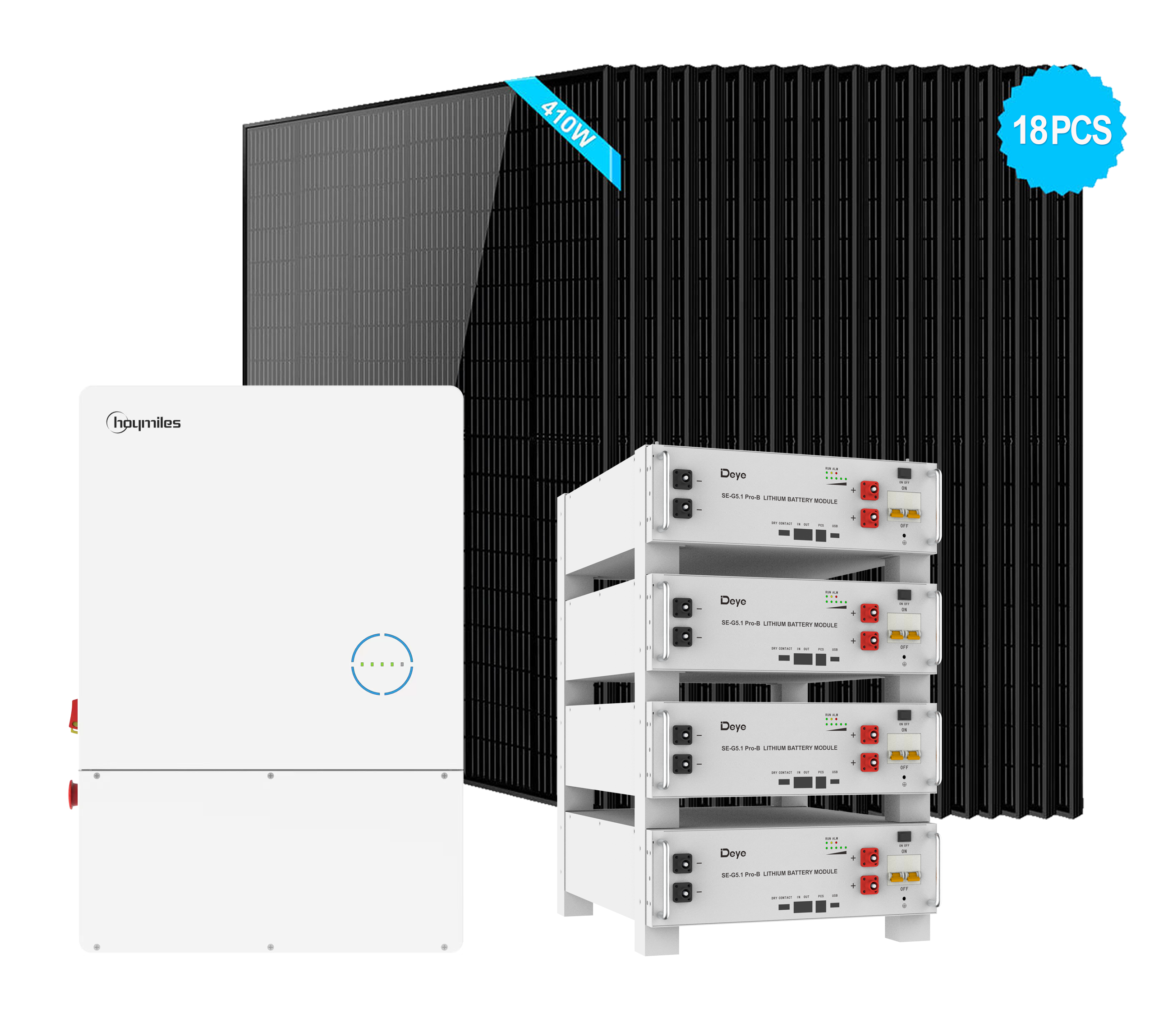 Hybrid Solar Kits With Hoymiles 9.6kW Hybrid Inverter + 4PCS Deye SE-G5.1 Pro-B 5.12kWh LFP Rack-Mounted Battery + 18PCS 410W Solar Panels