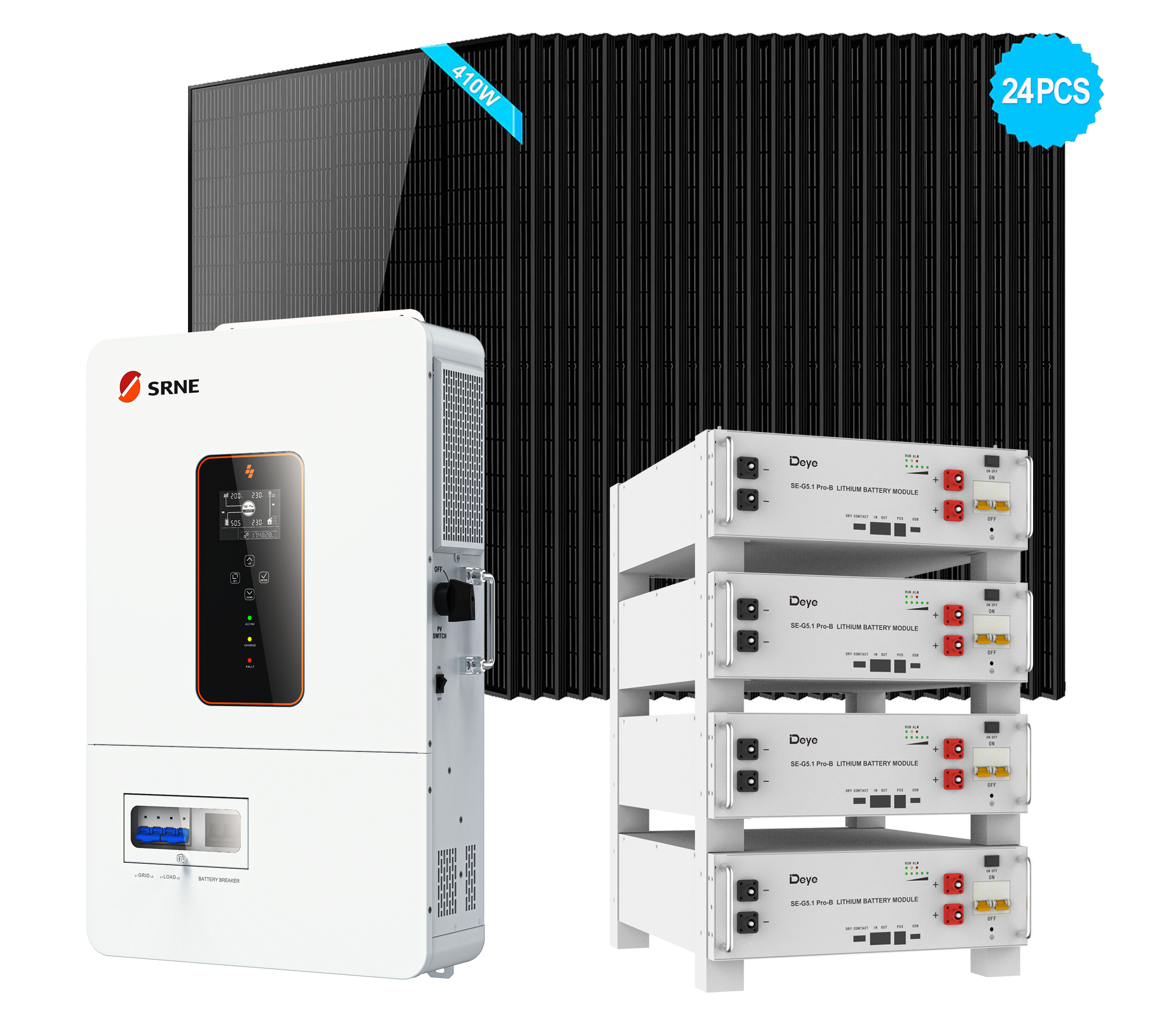 Off-Grid Solar Kits With SRNE 10kW Off-Grid Inverter + 4PCS Deye SE-G5.1 Pro-B 5.12kWh LFP Rack-Mounted Battery + 24PCS 410W Solar Panels