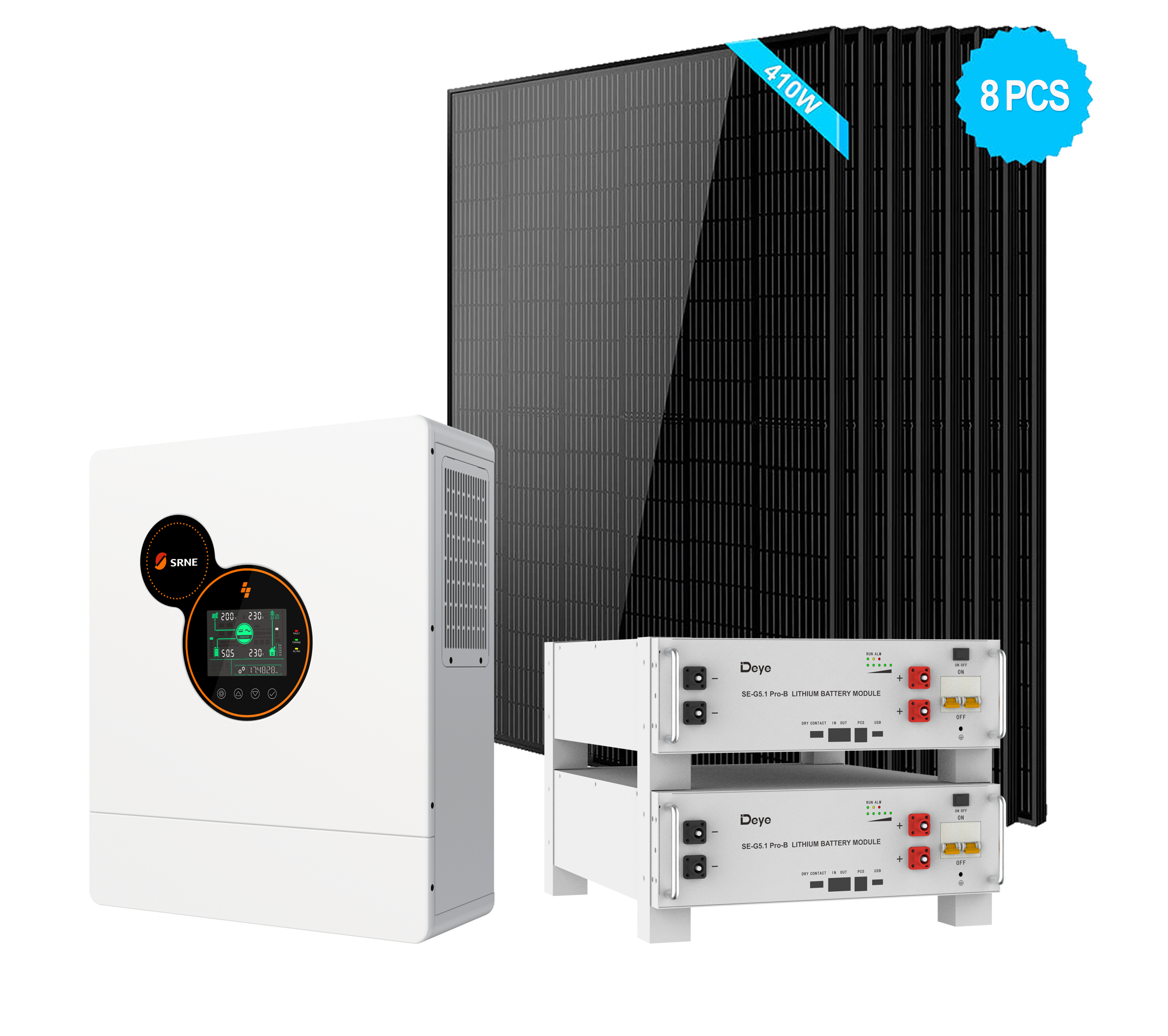 Off-Grid Solar Kits With SRNE 5kW Off-Grid Inverter + 2PCS Deye SE-G5.1 Pro-B 5.12kWh LFP Rack-Mounted Battery + 8PCS 410W Solar Panels